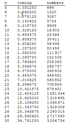 比较死的循环代码,花了5000s的时间才算完....另外个代码可以用并行,不知道速度能提高多少,或者你编译成C算算 Clear["Global`*"]; n = 100; n6 = n1 + n2 + n3 - n4 - n5; j = 0; t1 = AbsoluteTime[]; Do[If[n <= (n1 + n2 + n2 + n3 + n4 + n5 + n6)/2 <= 3 n && n6 >= 1, j = j + 1], {n1, 1, n}, {n2, 1, n1}, {n3, 1, n - n1 + n2}, {n4, 1, n1 - n2 + n3}, {n5, 1, n - n1 + n2 - n3 + n4}]; t2 = AbsoluteTime[]; t2 - t1 Print[j] 5038.6471942 1022862022 |