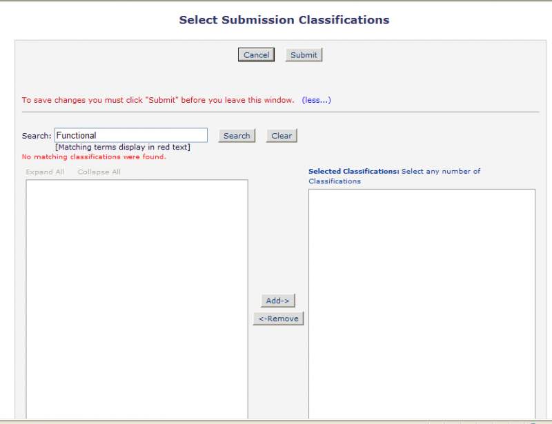 在"Search" 栏里无论填什么都显示"No matching classifications were found ".