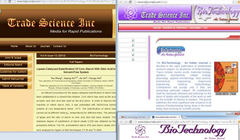 [感谢奖赏] 作者/编辑: Jiaying Xin, Yan Wang, Jia Shi, et al. 标题: Lipase-catalyzed esterification of corn-starch with oleic acid in solvent-free system 期刊: BioTechnology: An Indian Journal 出版日期: 看图 出版者: Trade Science, Inc * 期刊号: ISSN 0974 - 7435 图片来源: - http://www.tsijournals.com/tsijo ... ssue-12/abs_26.html - http://www.tsijournals.com/tsijo ... 0Journal/index.html - http://www.tsijournals.com/tsijo ... -Indian-Journal.pdf * http://www.tsijournals.com/btaij/ * 结论: 如果答案不是 ISSN 0974 - 7435 请考虑直接联系发行人 http://www.tsijournals.com/btaij/ << 可双击链接 ---------------------------- ISSN 0974 - 7435.jpg |