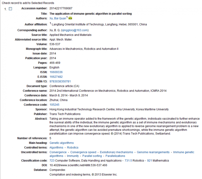 The application of immune genetic algorithm in parallel sorting Source: Applied Mechanics and Materials, v 536-537, p 466-469, 2014, Advances in Mechatronics, Robotics and Automation II 最好能给我检索页面接图哦,谢谢 |