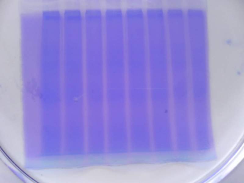 点的样都是一样的,考马斯亮蓝染色,就成这了,脱色剂染色剂都是实验室其他人用的,脱色剂1:4:5的乙酸:乙醇:水,没有出现明显的条带,只中间有两个稍微亮的区域