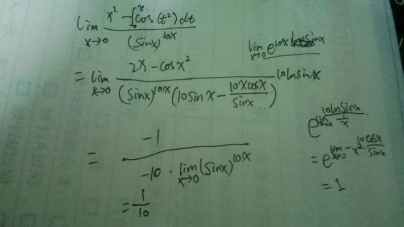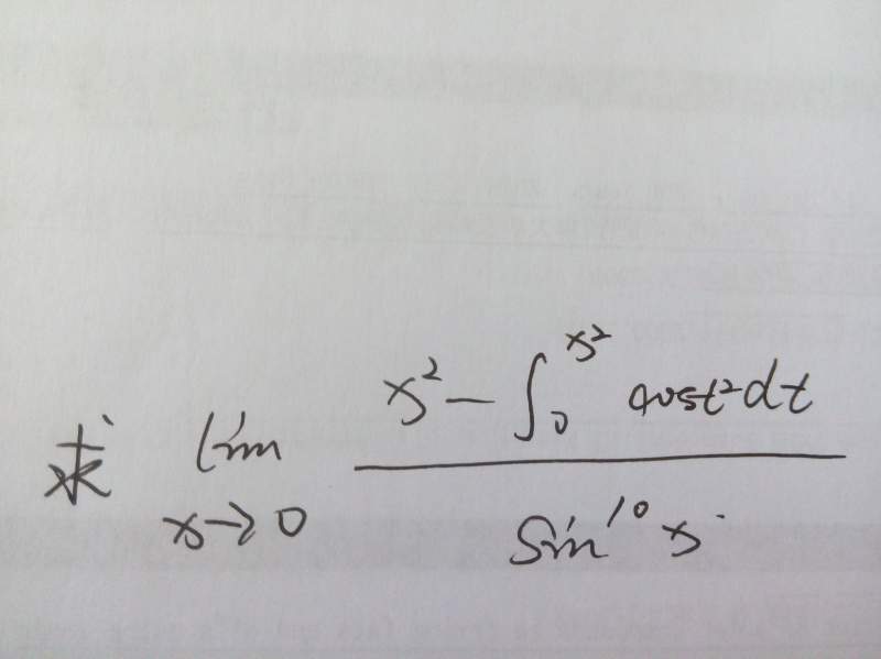 求极限,lim[x^2-cos(t^2)dt]/(sinx)^10 x趋向于0 注:cos(t^2)dt是求定积分,从0到x平方。最好能给出详细步骤,谢谢! IMG_20140607_124641.jpg |