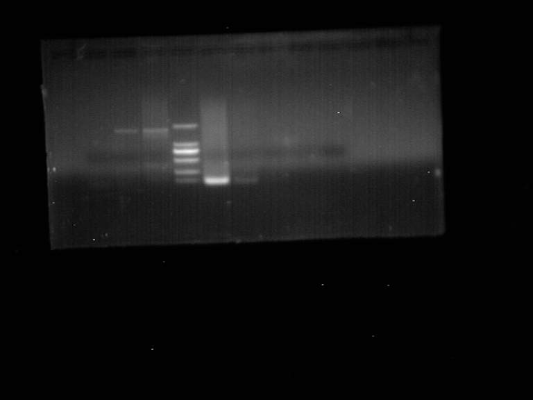 做温度梯度了,从MARKER往后的5个是做的温度梯度,温度从高到低,后三个是什么都没有,第二个只有二聚体,第一个就是看到的弥散的一大片,我用的是LA酶跑的。已经跑了好多回了,这是第一次看到希望。