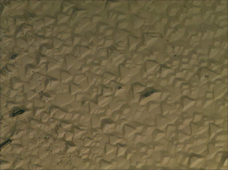 氟化钙单晶在4mol/L 盐酸 40度下 腐蚀了30分钟,没有;丢进去继续腐蚀20分钟,还是没有(如下图) 没有腐蚀坑啊,到底是(a)30分钟就已经腐蚀多了?(b)还没腐蚀完全,需要继续腐蚀? 样品有限,向大家求助, 32-40tem-50min-160ampli-2.jpg |