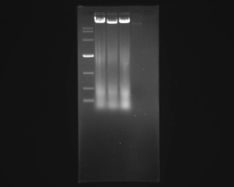 我用碧云天的DNA ladder 试剂盒提取DNA跑胶,结果如下:[img][/img] 泳道1是marker,2是control,3和4是加药组,5就无视吧 2,3,4都没差别,按理来说2应该没有后面的那么多小片段DNA才对吧,难道是我提取手法有问题? 123.JPG |
