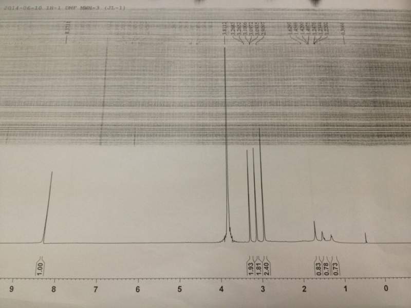 现在用氘代DMF和氘代DMSO混合液以及氘代氯仿分别溶解催化剂表面的积碳,离心后做液体核磁,所得到的谱图如下,自己菜鸟级别,完全不懂,求大神帮忙分析一下,十分感谢!