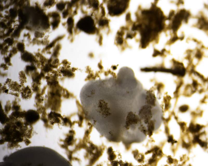 通过色泽,规则状,大小,我感觉应该是各种生化反应形成的无机晶体,因为水力冲刷而边界规则,而且是白色的,各种磷酸盐沉淀物,Ca,Mg沉淀物都有可能。