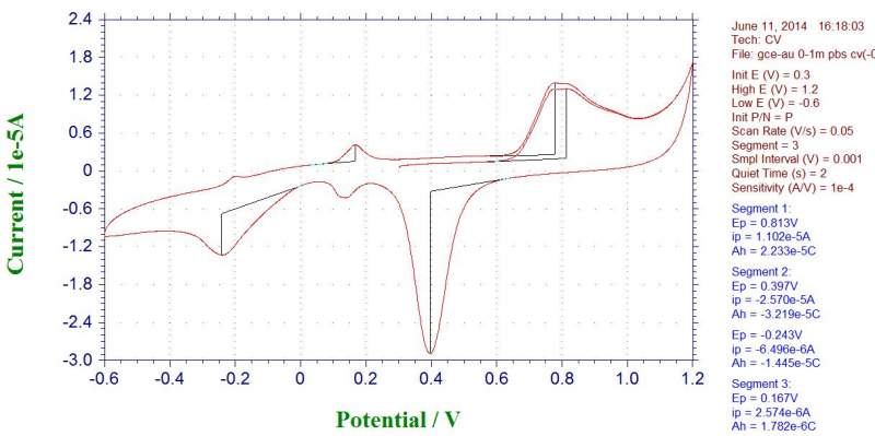 是我扫的CV图,溶液是PBS(没有除氧),工作电极是修饰了金纳米粒子的玻碳电极(用硫酸溶液电化学清洗过),对电机是Pt片,饱和甘汞做参比。除了Au的氧化还原峰外(0.8v,0.4V),在0.15V出的氧化还原峰和-0.2V处的还原峰,我不懂的归属和出峰的原因,重复了几次都有,求指教!