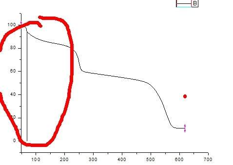 我用Origin将测得的TG曲线求导后得到了DTG曲线,但是原图又出现一条竖线无法去掉。急需解决方案!!