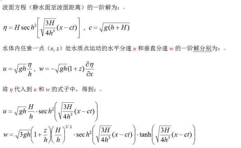 下面两个 图是从某书中转过来的,我不太明白孤波的水平流速u与垂向坐标没有任何关系吗?同一点处,不同水深点处的u都相等? u的表达式中没有看到与z相关的表达式呀?高手可否指点一下。 1.jpg 2.jpg |
