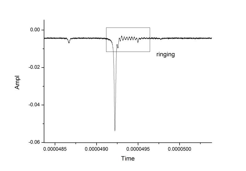 用MCP作飞行时间质谱的探测器,当信号峰很窄(~20ns)时,出现铃振(见附件图)。改变信号线长度、并联50欧电阻都不好使,郁闷好久了,求助大神。 说明:MCP示意如图一,MCP直径36mm,两片装配间隔0.2mm。第二片MCP到收集极距离2mm。 MCP示意图.jpg ringing.jpg |
