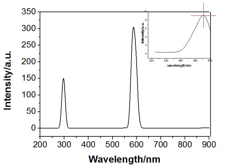 这是在291nm的激发波长下的发射光谱,图中在296nm.587nm.891nm处出现荧光峰,其中位于587nm出的是由于铕离子4f电子从5D0到7F1的跃迁,其他两个无法判断。给出了发射光谱图和光学带隙宽度图,求大神指点 ZS@~G3@LV@]G)~8TPH6TAPK.jpg PYT{UEDQG)HZMK7{MC}EM(R.jpg |
