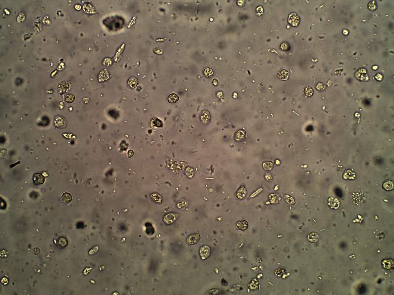 血便室温放置5d后普通光学显微镜40倍物镜下拍摄图片