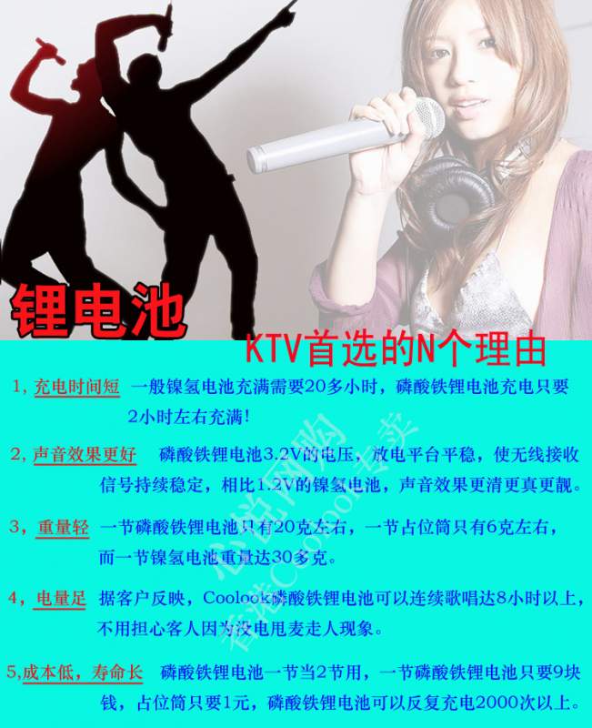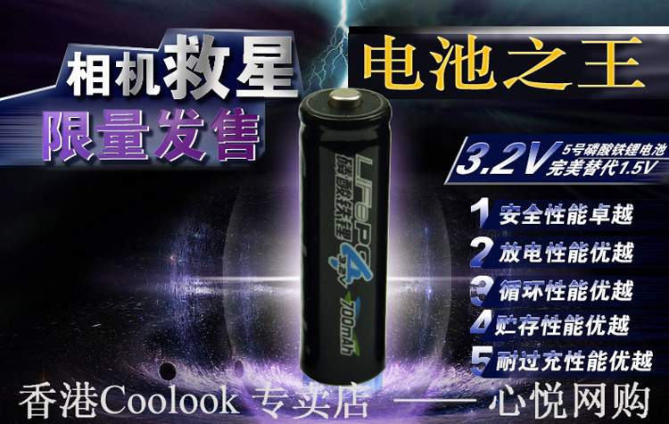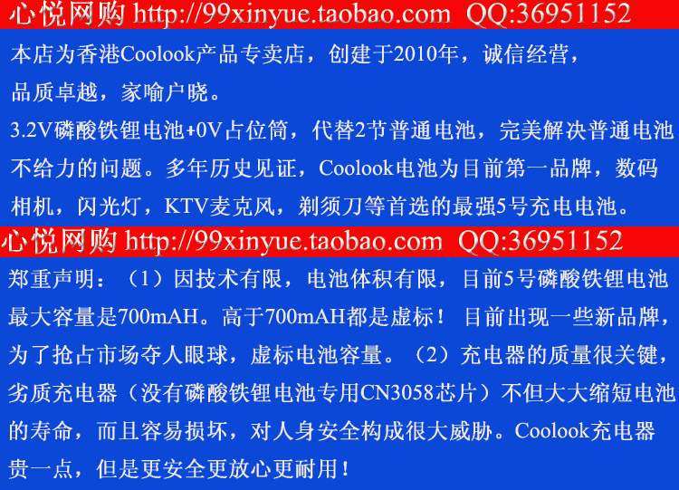 好东西才卖的长久,讲诚信才有长久生意!5年前的今天,我开网店了,专卖磷酸铁锂电池,5年后的今天,我的网店 心悦网购 http://99xinyue.taobao.com , 已经双皇冠,深受淘友们喜爱。 。感谢网友们一路对我店的支持!5周年店庆,全场打折回馈新老客户! 淘宝ID:xuzhouchen2009, QQ:36951152来看看我的热销宝贝吧, 香港coolook5号磷酸铁锂电池,数码相机的大救星,闪光灯最佳电池,KTV麦克风的神器!一节3.2V的磷酸铁锂电池配合1节0V的占位筒使用,完美解决普通电池不给力问题!5年见证,好评如潮。 香港coolook5号磷酸铁锂电池 http://item.taobao.com/item.htm? ... ;amp;id=10596376607 超值充电套装 http://item.taobao.com/item.htm? ... ;amp;_u=ca68lr97d41 更多宝贝,请大家光临我的小店 心悦网购 http://99xinyue.taobao.com , 淘宝ID : xuzhouchen2009 主营数码相机电池,手机充电宝。 Coolook5号磷酸铁锂电池 Coolook磷酸铁锂电池使用 为何选择Coolook.jpg Coolook -KTV.jpg 店铺 |