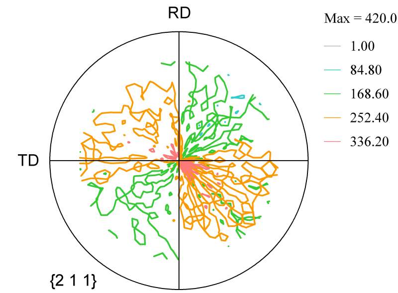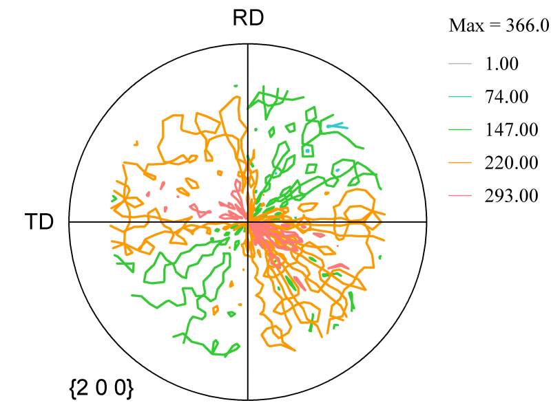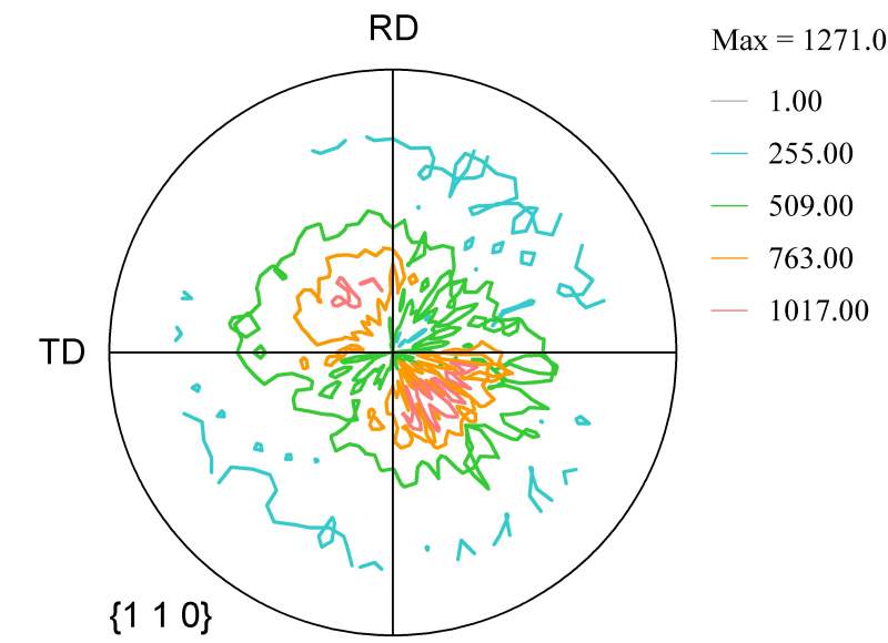 现在做的是低碳马氏体钢的轧制,用XRD测量织构,下面得到的是极图,请大家帮忙分析一下,感觉有些不对!