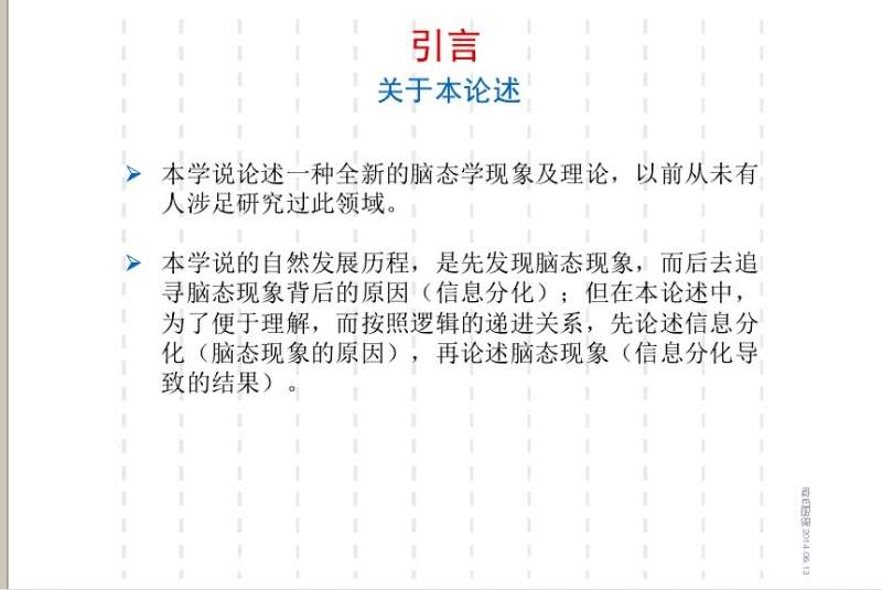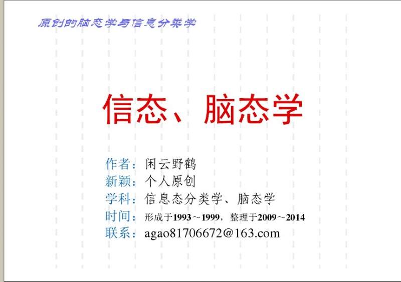 这是本人原创的学说(信息态分类学、脑态学),属于自然科学范畴,此为ppt简约讲稿,后续出视频讲解,详细学说另有专门文本论述,欢迎学习、传播扩散。 1.jpg 2.jpg 3.jpg [ Last edited by 唐tjg on 2014-6-15 at 10:49 ] |