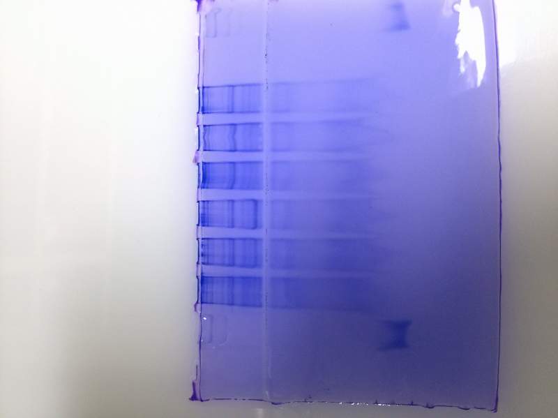想检测4kD 的小肽,用的是tricine sds page, 可是这个胶下面跑不整齐,是什么原因啊,虫友们,帮帮忙,给个答案吧