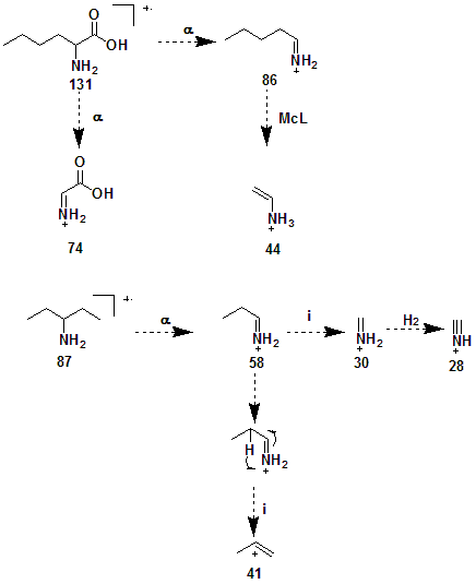 1、已知阿尔法氨基酸CH3CH2CH2CH2CH(NH2)COOH,用FBA软电离方法得知该氨基酸的分子离子质量为131u,写出m/z 86、74、44三个离子的产生过程。 2、已知伯胺为CH3CH2CH(NH2)CH2CH3,其质谱峰分别为m/z 58、 41、 30、 28,写出四个峰代表的离子的产生过程。 谢谢大家啦!对大家可能很简单,希望伸出援手! |