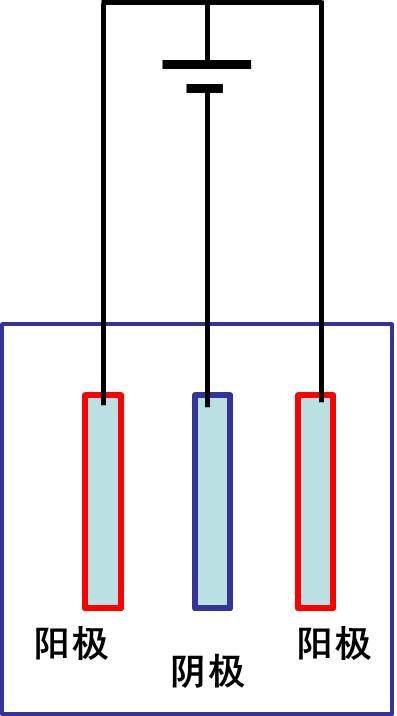 一个简单的问题,但是我没做过,所以不懂。 如下图所示,我想用双阳极做电镀,也就是阴极接电源负极,而两个阳极都接在正极。假如所有电极面积都为1dm2,而我想用5A/dm2的电流密度,那么电源的电流应该设为多少?考虑到正极出来以后有个分流,是不是应该将电源的输出电流设为10A? 图片1.jpg |