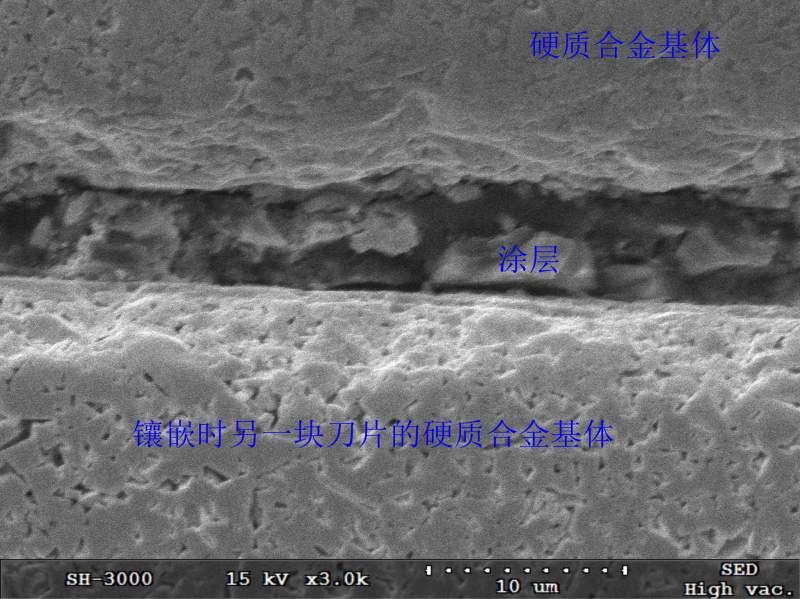 本人近期为了观察涂层厚度尝试对肯纳KC725M涂层(涂层:TiN+TiAlN,基体:硬质合金)刀片进行金相制作。对线切割后的刀片进行研磨抛光后,用硝酸+氢氟酸+水=1:1:1的腐蚀液进行了20s左右的腐蚀,然后在SEM下观看发现涂层如图所示,请问有知道是什么原因造成这一现象的?还有就是如何才在研磨抛光时保护好涂层而不使其崩碎?选取何种腐蚀液最好? 涂层厚度 |