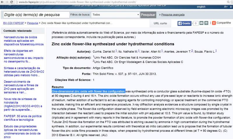 原图来自 " CDFM/FAPESP " [图1] CDFM 是 FAPESP 的一小部分,唯一项目由 Universidade Estadual Paulista 大学 Elson Longo 教授负责 [图2] Elson Longo 教授在 2007年 发表了一份氧化锌 - 相关文章 [图3] Elson Longo 教授很难联系 [几乎所有网站都以葡萄牙语为主] 不知道是否值得为 Nature 杂志里的花图与他联系 [图4] Tel: [+55](21)3907-8100 还发现一含 "flower-like" “花状” 标题的 ZnO - 相关文章, 不知是否有用 [图5] 图来源链接: 图1: https://www.nature.com/news/sout ... big-players-1.15394 图2: https://scholar.google.com.br/citations?user=OHmp6A4AAAAJ https://www.bv.fapesp.br/en/pesquisa/?q=CDFM&index= 图3: https://scholar.google.com.br/citations?user=OHmp6A4AAAAJ https://nanotecnologia.com.br/re ... blicacoes/2570_SnO2,%20ZnO%20and%20related%20polycrystalline%20compound%20semiconductors.pdf 图4: https://sbpmat.org.br/minientrev ... ngo-da-silva-unesp/ https://www.abc.org.br/resultado.php3?codigo=elson 图5: https://www.bv.fapesp.br/pt/publ ... ydrothermal-condit/ ------------------------------------- CDFM - FAPESP.jpg CDMF - Center for the Development of Functional Materials.jpg Elson Longo - ZnO.jpg Elson Longo de Silva.jpg 1D flower-like ZnO.jpg |