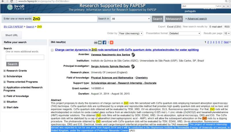 [感谢奖赏 - 请多给币] 要求: 我是说这个半导体的氧化锌发表的科研论文 反应: -1- 多如牛毛 [图1: 开始记录以来,全巴西有160+的与 ZnO 相关项目!!] 建议找: -2- FAPESP 赞助 [图2右上: 总数超过6页] -3- 开始不久, "___'13 ~ ___'15" -4- 有能下载的文章可查 [图3] -5- 大多在巴西国外进行的 [图2下方: This project of research internship abroad was expected to run for one year from August 2014 and it will be conducted in the Stephenson Institute for Renewable Energy of University of Liverpool, in United Kingdom, under the supervision of Professor Alexander Cowan ] 为方便查 "ZnO",提供图来源链接: 图1: https://vlab4u.info/nanotecnologias/core%20competencias/Pj-0.html 图2: https://www.bv.fapesp.br/en/pesquisa/?q=ZnO&index= 图3: https://www.ljemail.org/journal/ ... hors&page=5 ----------------------------- Brazil's NanoTech Literature.jpg FAPESP-ZnO.jpg Open Access = 免费下载.jpg |