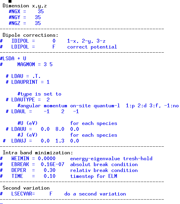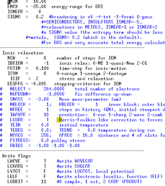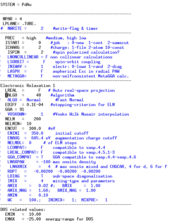 一个Pd7Au1的结构,优化得到的能量是-27.103331eV, 静态计算的结果中能量是-16.019415eV,这些结果都是在OSZICAAR里面看的 相差太大了。静态计算的INCAR在这里 INCAR.png INCAR2.png INCAR3.png |