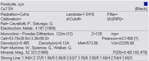 从晶型上看,这个是最接近的。 希望有所帮助 data for ICSD #10100 Coll Code 10100 Rec Date 1980/01/01 Mod Date 2008/08/01 Chem Name Copper Sulfide (1.94/1) Structured Cu1.9375 S Sum Cu1.9375 S1 ANX N16O31 Min Name Djurleite D(calc) 5.74 Title Djurleite (Cu1.94 S) and low chalcocite Cu2 S: New crystal structure studies Author(s) Evans, H.T.jr. Reference Science (1979), 203, 356-358 Unit Cell 26.8970(70) 15.745(3) 13.565(5) 90. 90.13(2) 90. Vol 5744.67 Z 128 Space Group P 1 21/n 1 SG Number 14 Cryst Sys monoclinic Pearson mP376 Wyckoff e94 R Value .11 Red Cell P 13.565 15.745 26.897 89.999 90.13 89.999 5744.671 Trans Red 0.000 0.000 1.000 / 0.000 -1.000 0.000 / 1.000 0.000 0.000 Comments Compound with mineral name: Djurleite The structure has been assigned a PDF number (calculated powder diffraction data): 01-071-1383 The structure has been assigned a PDF number (experimental powder diffraction data): 23-959 Structure type prototype : Cu31S16 Structure type : Cu31S16 X-ray diffraction from single crystal At least one temperature factor missing in the paper. Atom # OX SITE x y z SOF H S 1 +0 4 e 0.065(11) 0.992(11) 0.173(11) 1. 0 S 2 +0 4 e 0.057(11) 0.257(11) 0.161(11) 1. 0 S 3 +0 4 e 0.058(11) 0.513(11) 0.175(11) 1. 0 S 4 +0 4 e 0.056(11) 0.755(11) 0.175(11) 1. 0 S 5 +0 4 e 0.061(11) 0.118(11) 0.414(11) 1. 0 S 6 +0 4 e 0.057(11) 0.372(11) 0.421(11) 1. 0 S 7 +0 4 e 0.070(11) 0.633(11) 0.411(11) 1. 0 S 8 +0 4 e 0.067(11) 0.864(11) 0.414(11) 1. 0 S 9 +0 4 e 0.057(11) 0.993(11) 0.663(11) 1. 0 S 10 +0 4 e 0.066(11) 0.235(11) 0.667(11) 1. 0 S 11 +0 4 e 0.065(11) 0.490(11) 0.668(11) 1. 0 S 12 +0 4 e 0.069(11) 0.746(11) 0.672(11) 1. 0 S 13 +0 4 e 0.065(11) 0.131(11) 0.927(11) 1. 0 S 14 +0 4 e 0.064(11) 0.375(11) 0.915(11) 1. 0 S 15 +0 4 e 0.062(11) 0.629(11) 0.925(11) 1. 0 S 16 +0 4 e 0.066(11) 0.873(11) 0.902(11) 1. 0 S 17 +0 4 e 0.189(11) 0.129(11) 0.073(11) 1. 0 S 18 +0 4 e 0.187(11) 0.382(11) 0.080(11) 1. 0 S 19 +0 4 e 0.182(11) 0.624(11) 0.079(11) 1. 0 S 20 +0 4 e 0.184(11) 0.869(11) 0.074(11) 1. 0 S 21 +0 4 e 0.189(11) 0.004(11) 0.321(11) 1. 0 S 22 +0 4 e 0.193(11) 0.256(11) 0.340(11) 1. 0 S 23 +0 4 e 0.188(11) 0.496(11) 0.338(11) 1. 0 S 24 +0 4 e 0.195(11) 0.747(11) 0.328(11) 1. 0 S 25 +0 4 e 0.183(11) 0.124(11) 0.577(11) 1. 0 S 26 +0 4 e 0.183(11) 0.377(11) 0.574(11) 1. 0 S 27 +0 4 e 0.190(11) 0.622(11) 0.580(11) 1. 0 S 28 +0 4 e 0.187(11) 0.878(11) 0.574(11) 1. 0 S 29 +0 4 e 0.185(11) 0.999(11) 0.825(11) 1. 0 S 30 +0 4 e 0.188(11) 0.261(11) 0.829(11) 1. 0 S 31 +0 4 e 0.192(11) 0.509(11) 0.839(11) 1. 0 S 32 +0 4 e 0.191(11) 0.753(11) 0.826(11) 1. 0 Cu 1 +0 4 e 0.0585(70) 0.4995(70) 0.0013(70) 1. 0 Cu 2 +0 4 e 0.0629(70) 0.7546(70) 0.0057(70) 1. 0 Cu 3 +0 4 e 0.0658(70) 0.1287(70) 0.2463(70) 1. 0 Cu 4 +0 4 e 0.0666(70) 0.9891(70) 0.495(7) 1. 0 Cu 5 +0 4 e 0.0547(70) 0.2432(70) 0.500(7) 1. 0 Cu 6 +0 4 e 0.0637(70) 0.5088(70) 0.4961(70) 1. 0 Cu 7 +0 4 e 0.0674(70) 0.113(7) 0.7588(70) 1. 0 Cu 8 +0 4 e 0.0618(70) 0.3601(70) 0.7429(70) 1. 0 Cu 9 +0 4 e 0.0684(70) 0.6153(70) 0.755(7) 1. 0 Cu 10 +0 4 e 0.1882(70) 0.9989(70) 0.9975(70) 1. 0 Cu 11 +0 4 e 0.1932(70) 0.2538(70) 0.9947(70) 1. 0 Cu 12 +0 4 e 0.1801(70) 0.7454(70) 0.9895(70) 1. 0 Cu 13 +0 4 e 0.1886(70) 0.1258(70) 0.2391(70) 1. 0 Cu 14 +0 4 e 0.1944(70) 0.6213(70) 0.2498(70) 1. 0 Cu 15 +0 4 e 0.1901(70) 0.8707(70) 0.2424(70) 1. 0 Cu 16 +0 4 e 0.1817(70) 0.9986(70) 0.4833(70) 1. 0 Cu 17 +0 4 e 0.194(7) 0.7508(70) 0.4955(70) 1. 0 Cu 18 +0 4 e 0.1816(70) 0.1337(70) 0.7545(70) 1. 0 Cu 19 +0 4 e 0.189(7) 0.3852(70) 0.7412(70) 1. 0 Cu 20 +0 4 e 0.1931(70) 0.8773(70) 0.7385(70) 1. 0 Cu 21 +0 4 e 0.0161(70) 0.1536(70) 0.0656(70) 1. 0 Cu 22 +0 4 e 0.0169(70) 0.3899(70) 0.1376(70) 1. 0 Cu 23 +0 4 e 0.018(7) 0.6341(70) 0.1245(70) 1. 0 Cu 24 +0 4 e 0.0148(70) 0.877(7) 0.125(7) 1. 0 Cu 25 +0 4 e 0.0146(70) 0.2896(70) 0.3053(70) 1. 0 Cu 26 +0 4 e 0.0164(70) 0.4645(70) 0.3179(70) 1. 0 Cu 27 +0 4 e 0.0177(70) 0.7394(70) 0.3335(70) 1. 0 Cu 28 +0 4 e 0.014(7) 0.1048(70) 0.5903(70) 1. 0 Cu 29 +0 4 e 0.0112(70) 0.388(7) 0.5622(70) 1. 0 Cu 30 +0 4 e 0.0176(70) 0.8598(70) 0.6328(70) 1. 0 Cu 31 +0 4 e 0.0143(70) 0.9668(70) 0.8129(70) 1. 0 Cu 32 +0 4 e 0.1082(70) 0.0815(70) 0.0721(70) 1. 0 Cu 33 +0 4 e 0.1068(70) 0.3423(70) 0.0638(70) 1. 0 Cu 34 +0 4 e 0.1032(70) 0.9108(70) 0.050(7) 1. 0 Cu 35 +0 4 e 0.1081(70) 0.5347(70) 0.312(7) 1. 0 Cu 36 +0 4 e 0.112(7) 0.7677(70) 0.3252(70) 1. 0 Cu 37 +0 4 e 0.1086(70) 0.9563(70) 0.3169(70) 1. 0 Cu 38 +0 4 e 0.1082(70) 0.659(7) 0.5622(70) 1. 0 Cu 39 +0 4 e 0.1075(70) 0.8336(70) 0.5589(70) 1. 0 Cu 40 +0 4 e 0.1049(70) 0.0073(70) 0.8886(70) 1. 0 Cu 41 +0 4 e 0.1077(70) 0.250(7) 0.8788(70) 1. 0 Cu 42 +0 4 e 0.1129(70) 0.4712(70) 0.8329(70) 1. 0 Cu 43 +0 4 e 0.1091(70) 0.774(7) 0.8161(70) 1. 0 Cu 44 +0 4 e 0.1392(70) 0.4992(70) 0.1277(70) 1. 0 Cu 45 +0 4 e 0.1372(70) 0.7337(70) 0.1493(70) 1. 0 Cu 46 +0 4 e 0.1392(70) 0.1697(70) 0.4233(70) 1. 0 Cu 47 +0 4 e 0.1397(70) 0.3639(70) 0.4205(70) 1. 0 Cu 48 +0 4 e 0.1404(70) 0.0064(70) 0.6588(70) 1. 0 Cu 49 +0 4 e 0.1453(70) 0.2554(70) 0.610(7) 1. 0 Cu 50 +0 4 e 0.1443(70) 0.5029(70) 0.6162(70) 1. 0 Cu 51 +0 4 e 0.142(7) 0.596(7) 0.9293(70) 1. 0 Cu 52 +0 4 e 0.2241(70) 0.2886(70) 0.1852(70) 1. 0 Cu 53 +0 4 e 0.2303(70) 0.462(7) 0.1977(70) 1. 0 Cu 54 +0 4 e 0.2346(70) 0.1367(70) 0.4227(70) 1. 0 Cu 55 +0 4 e 0.2346(70) 0.3904(70) 0.4062(70) 1. 0 Cu 56 +0 4 e 0.2308(70) 0.5872(70) 0.4358(70) 1. 0 Cu 57 +0 4 e 0.2344(70) 0.5411(70) 0.6927(70) 1. 0 Cu 58 +0 4 e 0.2325(70) 0.7142(70) 0.6811(70) 1. 0 Cu 59 +0 4 e 0.2306(70) 0.4097(70) 0.9373(70) 1. 0 Cu 60 +0 4 e 0.2373(70) 0.6349(70) 0.8738(70) 1. 0 Cu 61 +0 4 e 0.2359(70) 0.8561(70) 0.9123(70) 1. 0 Cu 62 +0 4 e 0.127(7) 0.2612(70) 0.2454(70) 1. 0 *end for ICSD #10100 |