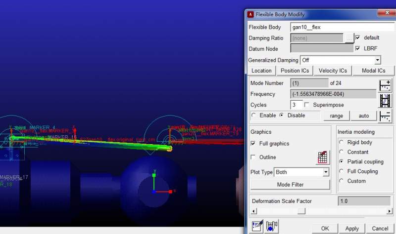 首先,两杆机械臂为薄壁圆杆壁厚1.5mm长6m,在ansys中无法划分网格(SolidWorks建好模导进去实体试过一些单元类型总出错)无法输出中性文件,此模型为在adams中利用他自身建立柔性体flex进行网格划分,现出现两个问题
