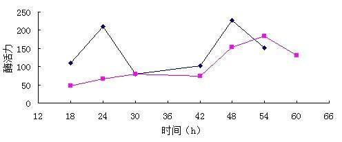 我做的实验是利用杆菌生产碱性蛋白酶,在做发酵条件发酵时间单因素优化中,有一株细菌在两个时间点上发酵液的酶活力都很高,这是什么原因,如图中的黑色线 4ec2d5628535e5ddb737a63074c6a7efcf1b62c1.jpg |