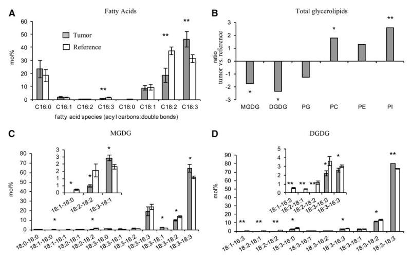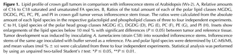 In order to trace back the origin of 18:3, the major lipid classes of plastids, MGDG, DGDG, and phosphatidylglycerol (PG), as well as those of the ER, phosphytidylcholine (PC), phosphatidylethanolamine (PE), and phosphatidylinositol (PI), were analyzed. the total amounts of MGDG (21.76-fold,P= 0.022), DGDG (22.36-fold,P=0.032),andPG(21.25-fold,P=0.153) were decreased in crown gall tumors, and again, the ER-specific phospholipid pools, PC (1.79-fold, 0.05), PE (1.31-fold, P= 0.29), and PI (2.61-fold,P= 0.002), were increased (Fig. 1B). Within all classes of the ER-derived lipids, the levels of those containing 18:3 were significantly (P#0.05) higher in tumors compared with reference stems (Fig. 1, C–H).