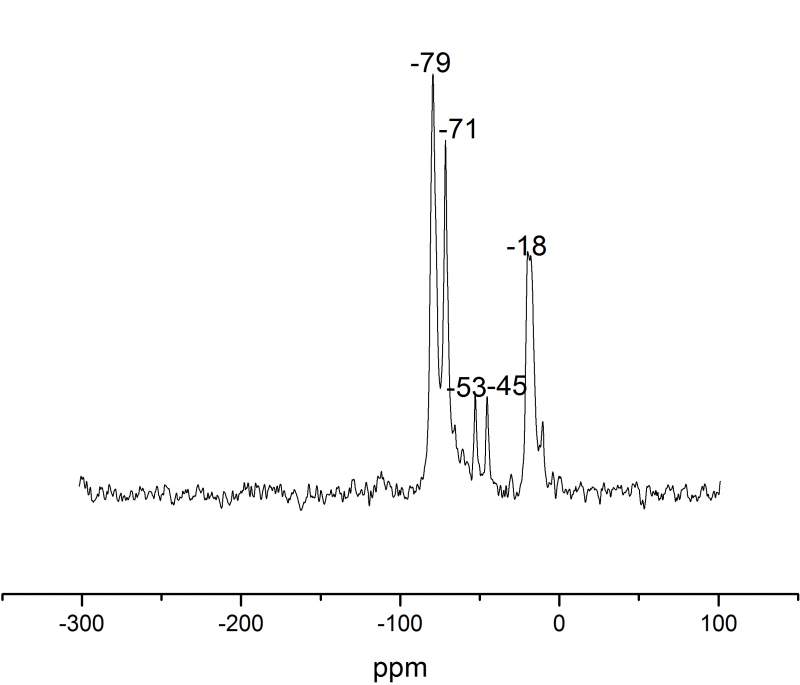 Hi,我有一个固化后的有机硅杂化树脂,做了一个固体硅核磁,有几个峰不太能确定是什么结构,大家帮我看看呗。 其中,-45是T0? -52是T1? -71是T3? -79和-18会是什么结构? 1.jpg |