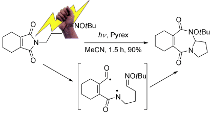 A light touch is all that is required to cleave a maleimide CN bond to effect a [5+2] photocycloaddition with a sterically encumbered CN moiety (see scheme).