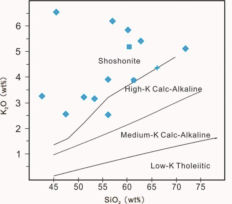 你的样品中的K2O的含量都很高,按照范围应该都是shoshonite的范围了。不过有关问题,你首先要确认这些样品没有蚀变过。也就是说,样品中的K2O是岩石本身的,不是通过钾交代等过程加入的。