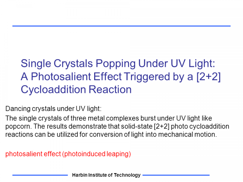 UV引起的跳跃反应 幻灯片1.PNG 幻灯片2.PNG 幻灯片3.PNG 幻灯片4.PNG 幻灯片5.PNG 亮点: UV照射引起了机械运动; 结构的变化引起了张力的变化,从而造成了晶格的破裂。引起了晶体的崩塌。 |