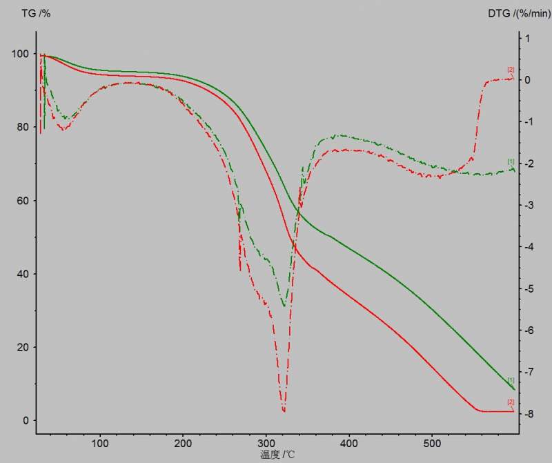 你的这个图应该看到是1号在250-300℃失重速率比2号的要小,所以最终测试1号的着火温度要低,如果实在不好看的话,你就看斜率,斜率绝对值越大的点,所对应的温度,接近着火或者分解的温度上限,这个可以用来指导材料的加工温度