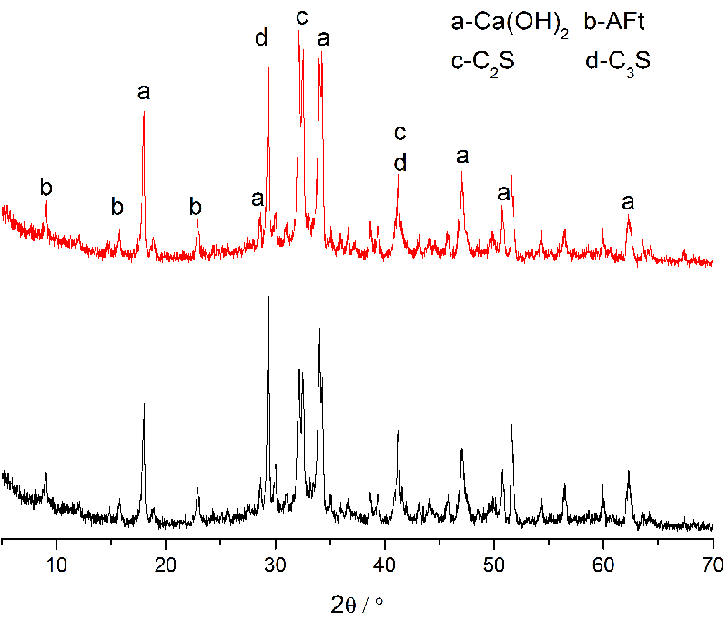 各位大侠帮忙看一下,纯水泥净浆(只有水泥,不含矿物)水化产物XRD图谱各峰对应物质是否正确?另外,我做的是内养护方面的,红色样品中加入了可以内养护的纤维,能否说明红色谱峰的水化进程快于黑色谱峰?52度左右对应的峰可能是什么?