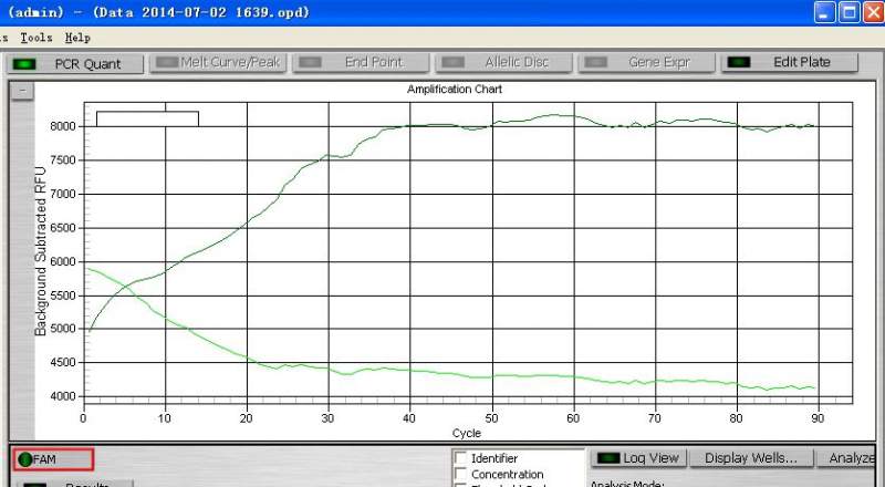 我的阴性对照和阳性对照对比还是很明显的,上升的那条线是阳性的,下降的那条线是阴性的,这个background substracted RFU具体指的是什么,我不太明白,我想把纵坐标设置成FAM的荧光信号,怎么做啊 这个是NASBA,用荧光探针检测反应产物,看别人文献里的图都很平滑,我这个很不好, 图像 1_副本.jpg |