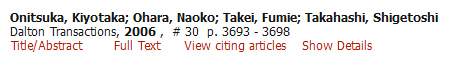 各位大神 帮帮忙 找找这篇文献,看能帮小弟下载的,就帮帮忙吧,谢谢咯 Onitsuka, Kiyotaka; Ohara, Naoko; Takei, Fumie; Takahashi, Shigetoshi Dalton Transactions 2006 #30 p. 3693-3698 (0JC0_KKA5U{9N(B9O5]C)L.jpg |