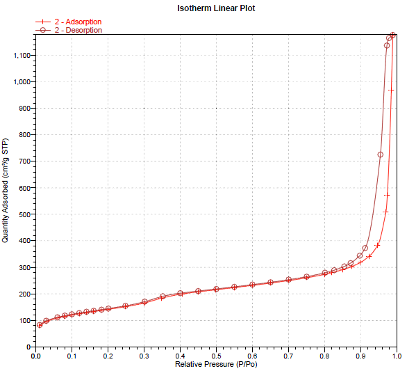各位高手,本人做的中孔分子筛,做了BET之后的图是下图这样,我很困惑,图看起来很像第二类型曲线,但是又有回滞环,应该有中孔,但是回滞环的初始转折点在0.8~0.9左右,不像是典型的中孔吸附转折点。这个是怎么回事呢? 另外最可几孔径分布是2~3nm 应该是属于中孔分子筛,不过孔径分布图 后面很奇怪,有30~50nm的峰,这个是怎么回事呢 孔分布.png |