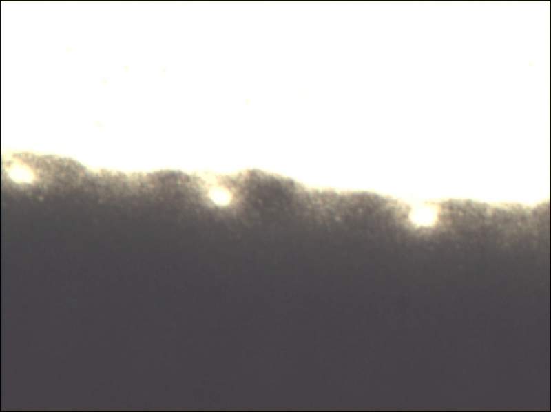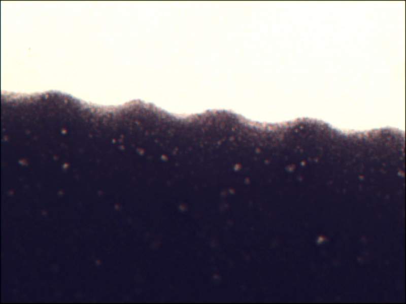 2 幅图是丝网印刷制备得到的薄膜,放大400倍得到的边缘部分的图像,请问这两种边缘的差异会与什么因素有关呢?与涂料的粘度关系大吗?希望高手指点。