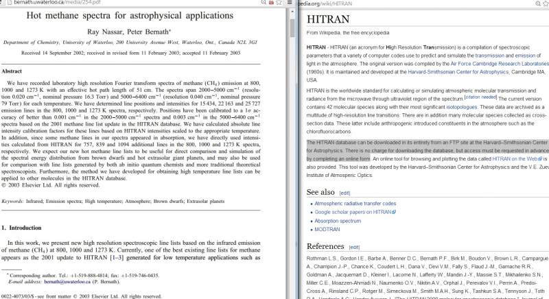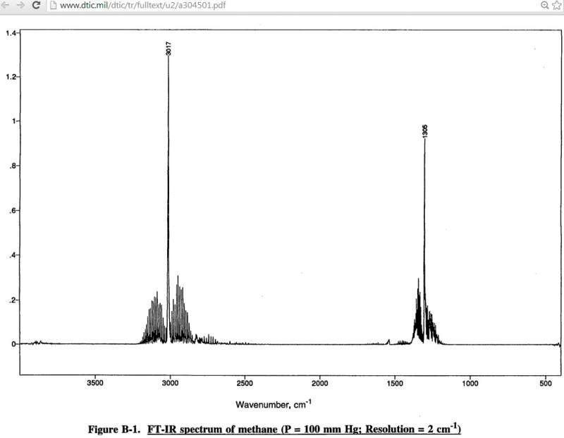 [感谢奖赏 - 希望中用] 图1 像是你想要的 "波长或者波数对应的吸收值" 吗 ?? 如果是 [如果真像 图1 明亮部分所说 "星号位置看到 FT-IR 峰"] 就表示甲烷的 FT-IR 光谱是可算的 https://bernath.uwaterloo.ca/media/254.pdf 并且已被计算多年 https://www.cfa.harvard.edu/hitran/Download/HITRAN2k.pdf 获得许可后,马上可以下载所有数据 [图2,3] https://en.wikipedia.org/wiki/HITRAN https://www.ontar.com/Software/P ... item=HITRANDatabase https://badc.nerc.ac.uk/view/bad ... _dataent_cwvc-hitrn 图4 来源不同,仅供参考 https://www.dtic.mil/dtic/tr/fulltext/u2/a304501.pdf -------------- HITRAN 原始数据.jpg HITRAN 甲烷数据文章.jpg HITRAN 数据库.jpg 甲烷 FT-IR 光谱.jpg |
