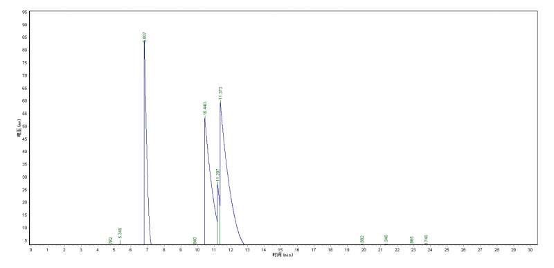 GC:北分3400;柱子:KB-Al2O3/Na2SO4;条件:40℃(5min)to100℃(0min)at 1℃/min,汽化室180℃,检测器FID:200℃.谱图如下。10——13min处的峰总是分不开,求解决办法。 0070.JPG |