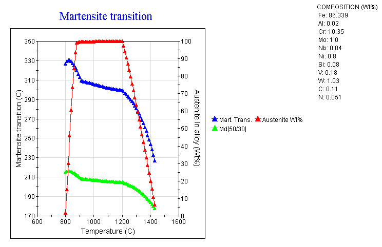 | 哪位高手帮我用软件计算一下Ms点,利用热力学的知识,什么吉布斯自由能啥的,而不是用那些总结出来的经验公式。化学成分如下:C 0.11 Cr 10.35 Mn 0.41 Ni0.8 Mo1 N 0.051 Nb 0.04 Si 0.08 W 1.03 V 0.18 Al 0.02 (wt%).谢谢了 |