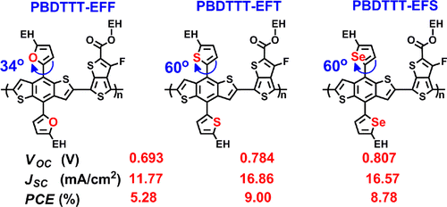 Recently, the benzodithiophene- (BDT-) based polymers with conjugated side groups attracted considerable attention due to their superior properties in polymer solar cells (PSCs), so the investigation of the side chain effects on the photovoltaic properties of this type of polymers is an interesting and important topic for molecular design. Herein, three conjugated polymers based on BDT and thieno[3,4-b]thiophene units with furan, thiophene and selenophene as side groups, named as PBDTTT-EFF, PBDTTT-EFT, and PBDTTT-EFS, were synthesized and applied in polymer solar cells. The polymers were characterized in parallel by absorption spectroscopy, thermogravimetric analysis (TGA), density functional theory (DFT), ultraviolet photoemission spectroscopy (UPS), X-ray diffraction (XRD), and photovoltaic measurements. The results show that the dihedral angles between the BDT and conjugated side groups play important roles in affecting the absorption bands, HOMO levels, crystallinities, and aggregation sizes of the polymers. The photovoltaic results indicate that PBDTTT-EFT and PBDTTT-EFS show similar photovoltaic characteristics in device, and PCEs of 9.0% and 8.78% were obtained, respectively. The device of PBDTTT-EFF shows a Voc of 0.69 V and a Jsc of 11.77 mA/cm2, which are lower than those in the devices based on the other two polymers. Overall, this work suggests that the photovoltaic properties of the BDT-based polymers can be effectively tuned by introducing conjugated side groups with varied steric hindrance.![2014年两维共轭光伏聚合物的侧链设计规律]()