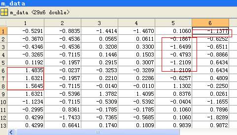 今天看到这样一条语句[m_data,mx,stdx]=autosc(input); 其中mx应该是input中每一列的平均值,stdx应该是input中每一列的方差。可是m_data是什么呢?开始时,以为是将input数据化为-1到1之间。可是我做了一个实验发现m_data中有大于1的值也有小于-1的值。 inout.jpg m_data.jpg |