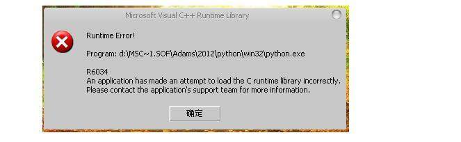 安装Adams2012后,启动view,弹出R6034错误提示;每次打开都会出现这种情况,关闭弹出的错误对话框,不影响软件使用。不过每次打开,都觉得很纠结呀。请各位大神指点指点,谢谢! 未命名.JPG |