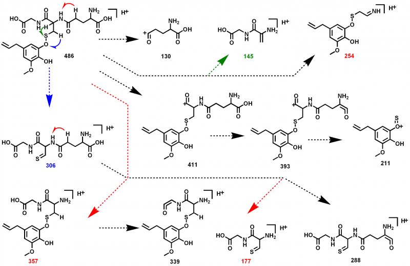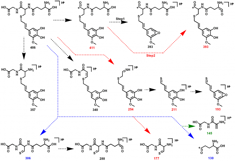 分子量为180的化合物和GSH结合得到485化合物。 分子量:[485+H+]=486,正离子模式。 问题:1、145的碎片为什么不是147? 2、411~393, 306~288,211~193都是少了18,是少了水分子吧,但是结构上怎么去掉的呢? 3、306的结构分析的对吗? 4、211、177和179的结构不知道是什么样的? 谢谢啦! |