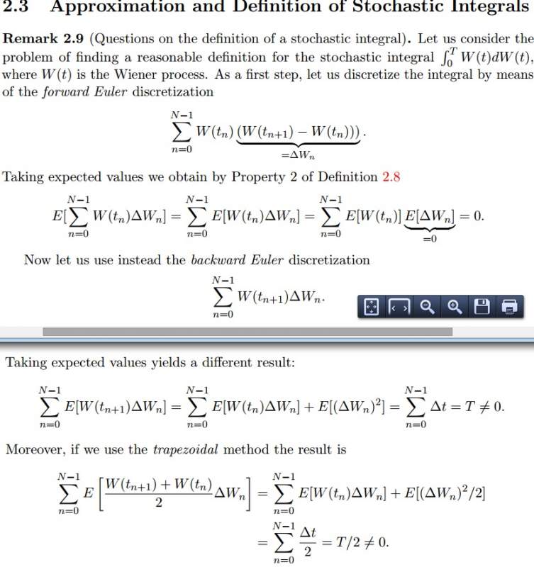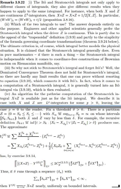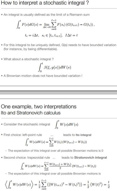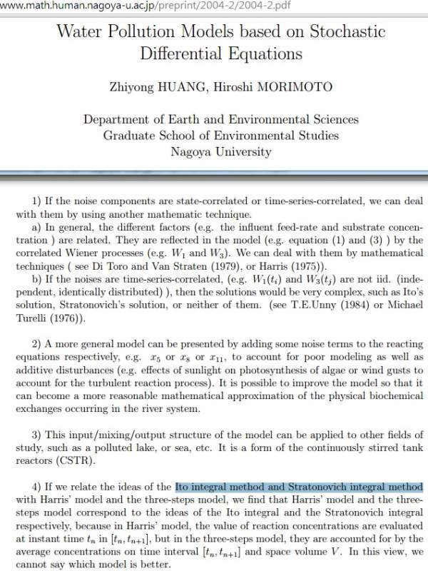 [感谢奖赏] 关于测污染物通量的 “integral method” 方法 ? 请问是关于污水的文章吗? 问题是关于 Ito 和 Stratonovich 积分法吗? [图1] https://www.math.human.nagoya-u.ac.jp/preprint/2004-2/2004-2.pdf Ito 是 Stratonovich 积分法的一种 Ito 和 Stratonovich 积分是 stochastic integrals, 和一般 Riemann sum integrals 不同 [图2] https://people.cs.kuleuven.be/~g ... scale-lecture-6.pdf 以上链接是我可找到最简洁的有关总结,如嫌不够,可看 - Stochastic Integral 定义 [图3] - Stratonovich 和 Ito 积分的更详细区别 [图4] 加提 2 篇应用文章 https://www.caam.rice.edu/~cox/stoch/dhigham.pdf https://www.math.kth.se/~szepessy/sdepde.pdf --------------------------------- 污水原文.jpg Stratonovich 和 Ito = 两种 Stochastic Integral.jpg Stochastic Integral 定义.jpg Stratonovich 和 Ito - 更详细区别.jpg |