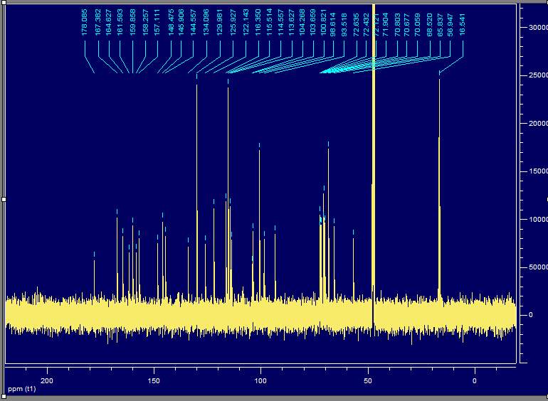 从植物的叶子里分离出的物质,应该是黄酮类化合物,做完质谱分析其分子量分别为756、744,本人不懂核磁,求高手帮忙!